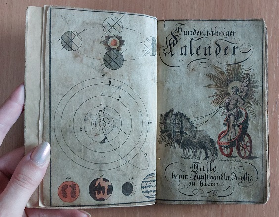 KALENDER.– DREYSSIG: Hundertjähriger Kalender beim Kunsthändler Dreyssig zu haben. + Ewiger Kalender. 2. Aufl. des Kalenders für die Jahre 1801 – 1900. 2 Bände in 1 Bd. Halle (Dreyssig), ca 1800. kl. 8°. 92 S. mit gestochenem kolorierten Frontispiz und gestochenem kolorierten Kupfertitel sowie einige kleinen Holzschnitten sowie 72 S. mit gestochenem Titelblatt und Kopfvignetten. Pb der Zeit mit neurem Leinenrücken. innen teils stärker fleckig und wasserandig. Der 100-jährige Kalende ist ein traditioneller Wetterkalender, der auf alten Wetterbeobachtungen und astrologischen Vorhersagen basiert. Er soll Wetterveränderungen vorhersagen, was besonders in der Landwirtschaft hilfreich sein kann.