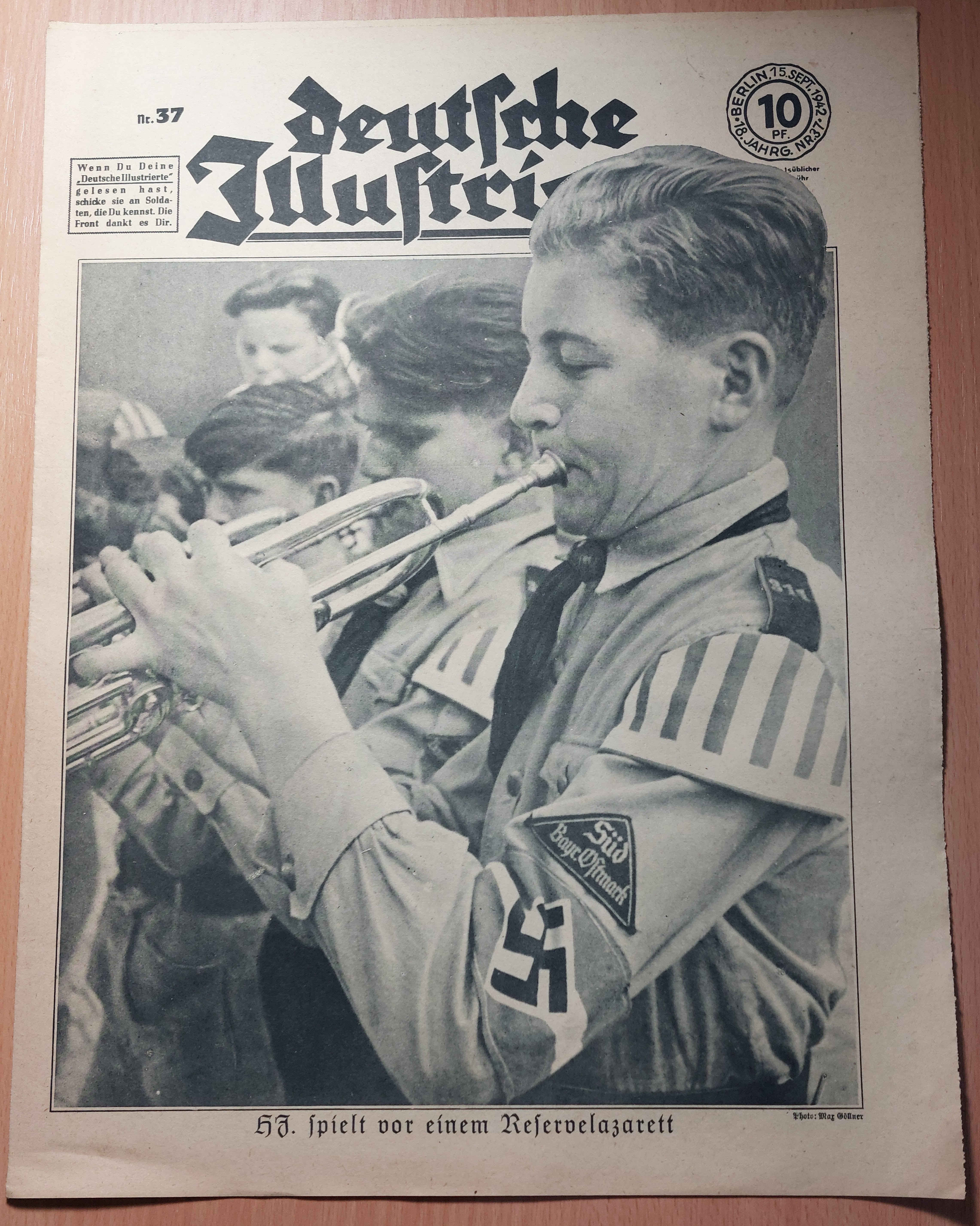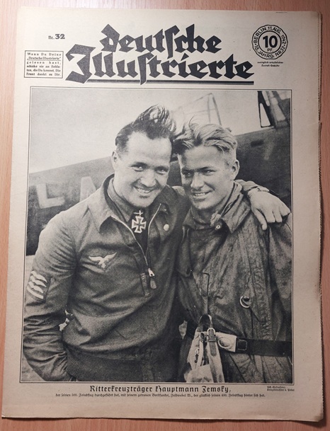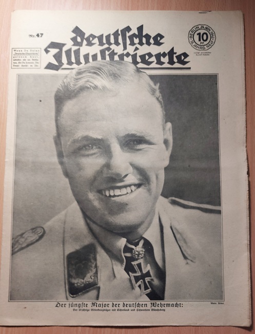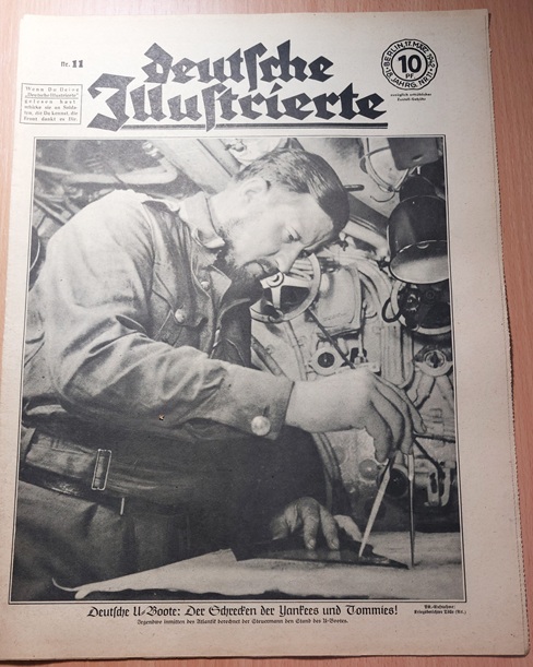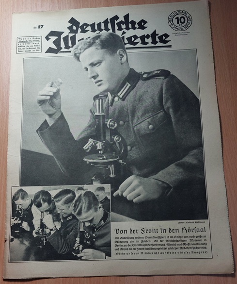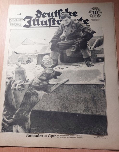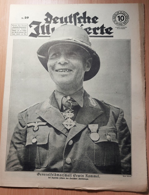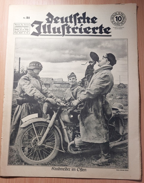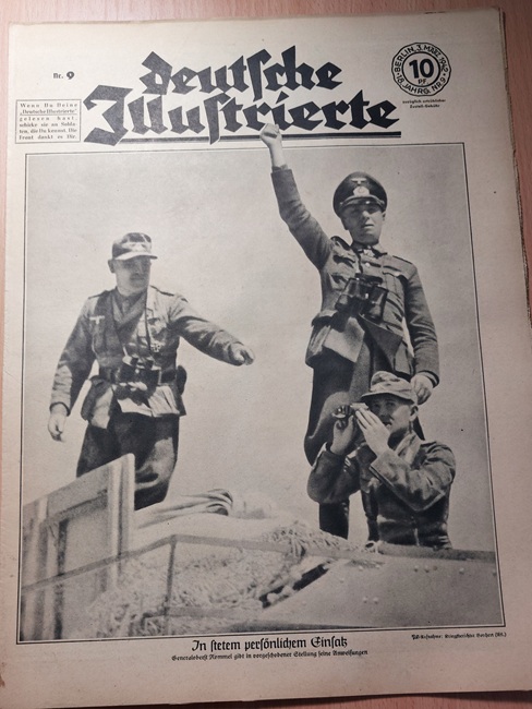 2. WELTKRIEG.– ZIMMERMANN, Richard: (Redaktion) Deutsche Illustrierte. 18. Jahrgang. 51 (von 52) Heften. Berlin (Erich Zander), 1942. 37 x 28 cm. über 500 S. mit zahlr. zumeist fotografischen Bildern. ill. OBr. Kanten teils bestoßen, schattenrandig und gebräunt, vereinzelte Einrisse, die letzten Hefte teils am Rand lädiert, es fehlt das Heft Nr. 16. Eindrucksvolles Dokument für Nationalsozialismus und 2. Weltkrieg. „Deutsche Illustrierte“ ist der Name einer Zeitschrift, die von 1928 bis 1944 in Deutschland erschienen ist. Es handelte sich um ein Magazin mit einem breiten Themenspektrum, das sowohl aktuelle politische und gesellschaftliche Ereignisse als auch kulturelle Inhalte und Unterhaltung umfasste. Die Zeitschrift war bekannt für ihre hochwertigen Illustrationen und Fotografien. (Wikipedia)