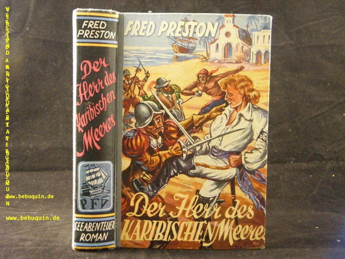PRESTON, Fred: Der Herr des Karibischen Meeres. Seeabenteuer-Roman. Marl Hüls (Feldmann), 1953. 269 S. farb. ill. OHLn. gestempeltes Leihbuch, schönes Ex. 1. Aufl. dieser Ausgabe.