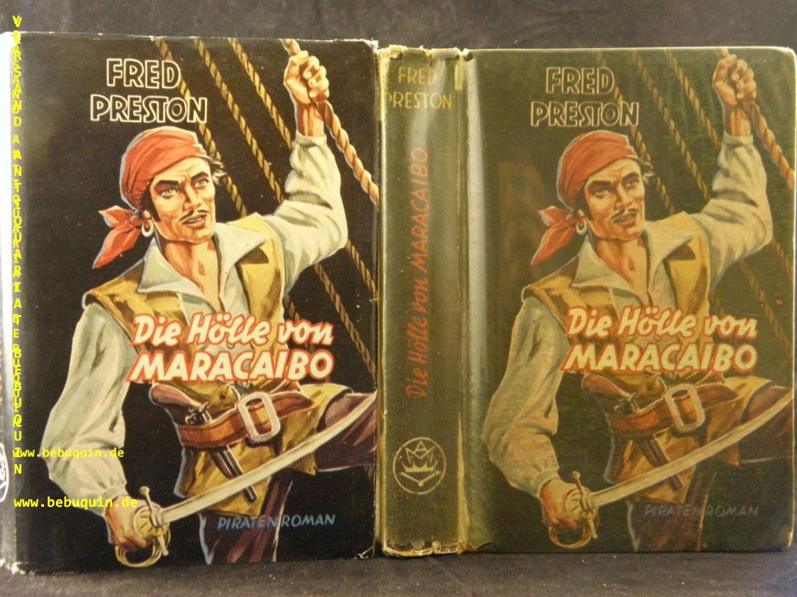 PRESTON, Fred: Die Hölle von Maracaibo. Piratenroman. Castrop-Rauxel (Mülbüsch), 1953. 256 S. farb. ill. OPb mit OUmschl. gestempeltes Leihbuch, Kanten berieben. 1. Aufl. dieser Ausgabe.