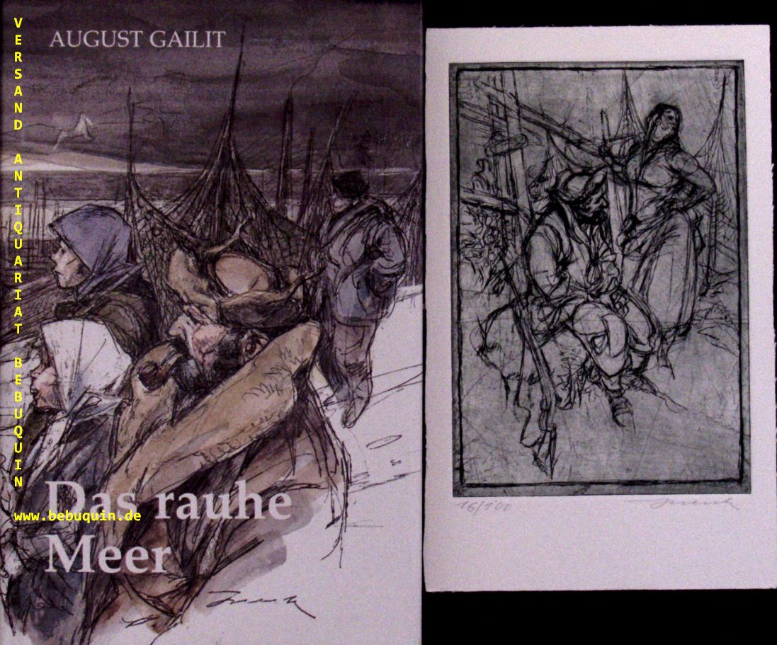 BUSCH.– GAILIT, August: Das rauhe Meer. Roman. Memmingen (Dietrich), 1985. 272 S. mit 16 Zeichnungen von Wilhelm M. Busch. OLn mit OUmschl. tadellos. Nr. 16 von 100 Ex. der Vorzugsausgabe mit einer numerierten und signierten Original-Radierung von Wilhelm M. Busch inliegend.