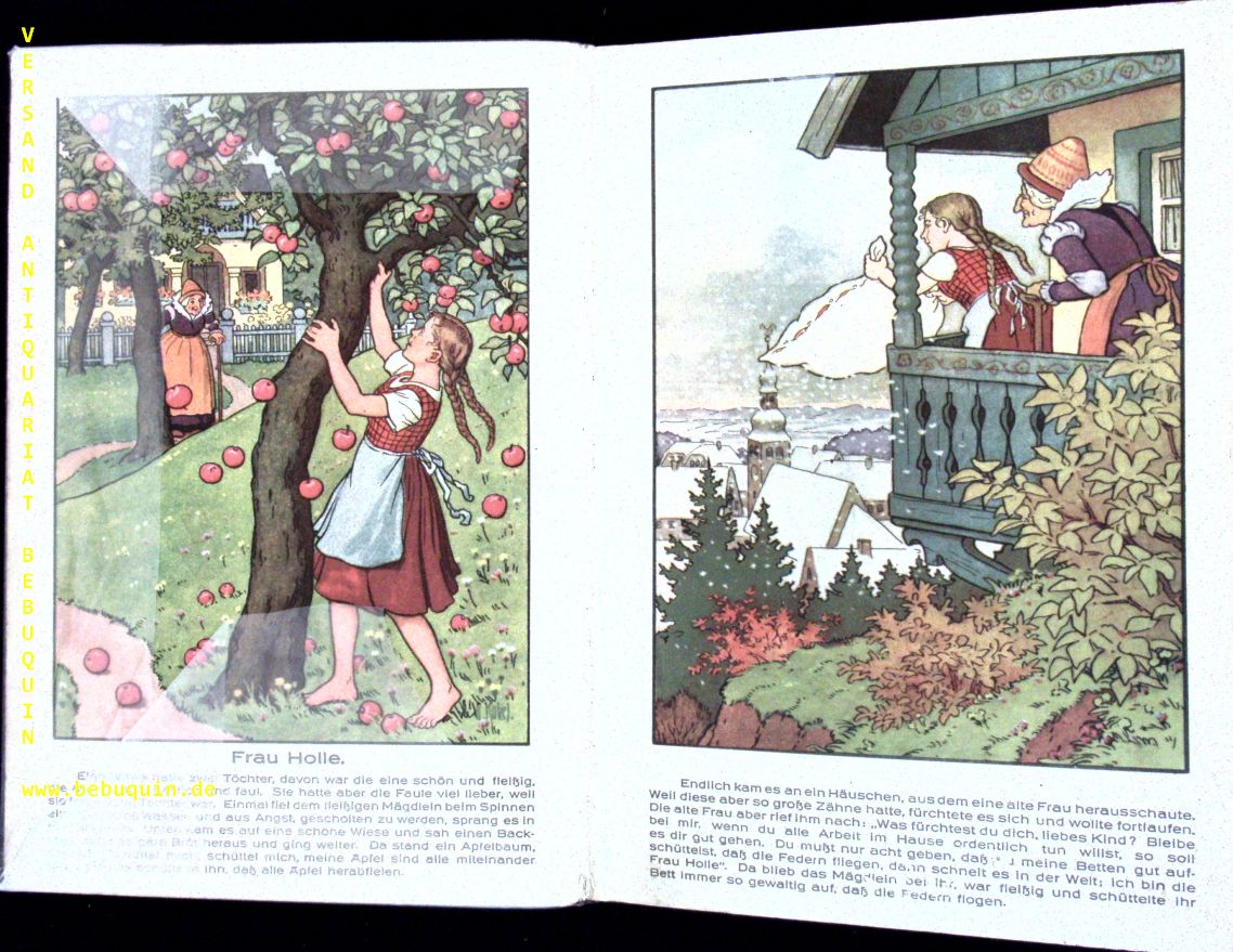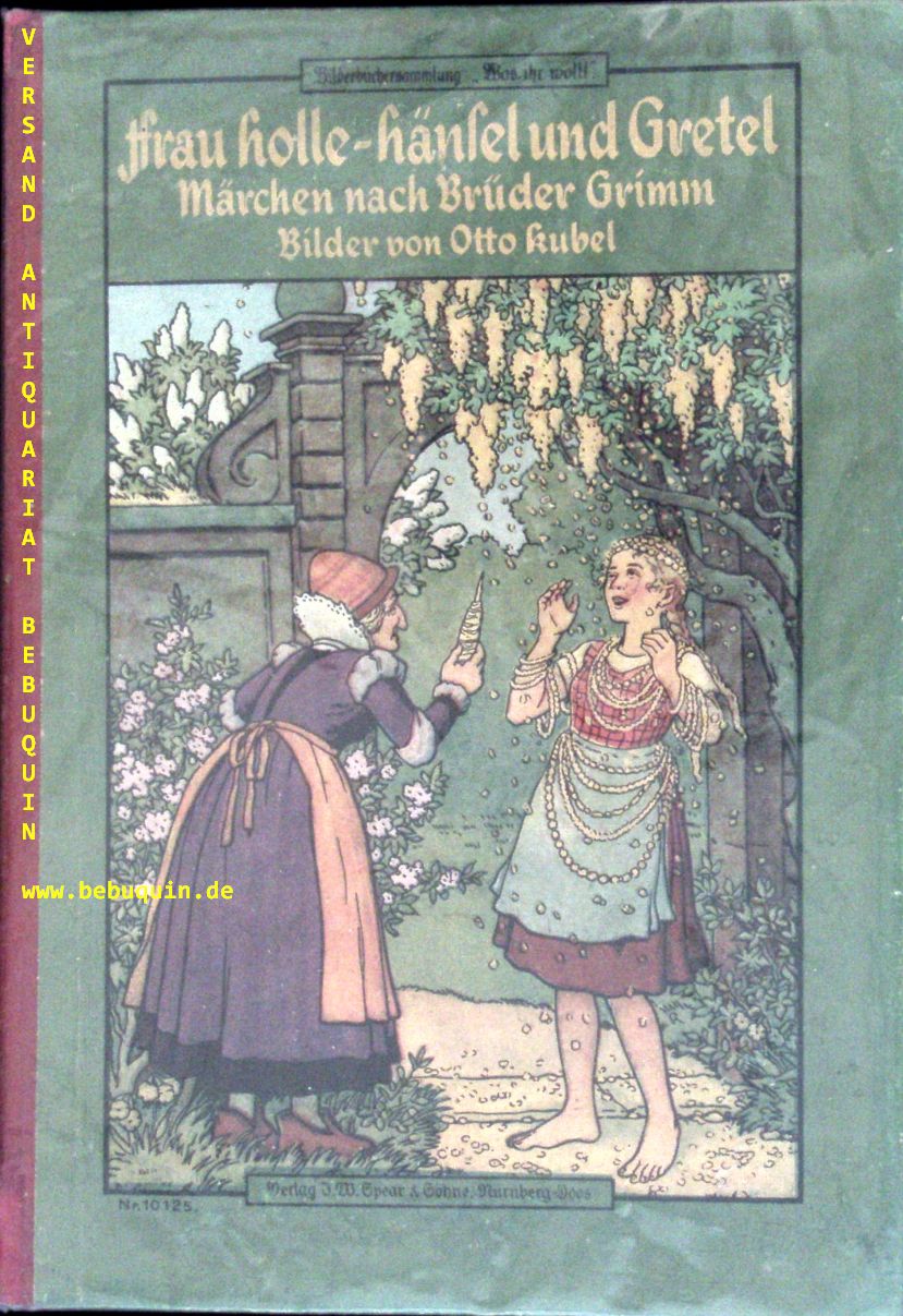 KUBEL.– GRIMM, Brüder: Frau Holle – Hänsel und Gretel. Märchen. Nürnberg (Spear), ca 1920. Gr. 8°. 6 S. aus unzerbrechlichem Kartton mit farb. Bildern von Otto Kubel. Farb. ill. OHLn. gutes Ex. seltene EA dieses Märchen-Bilderbuchs.