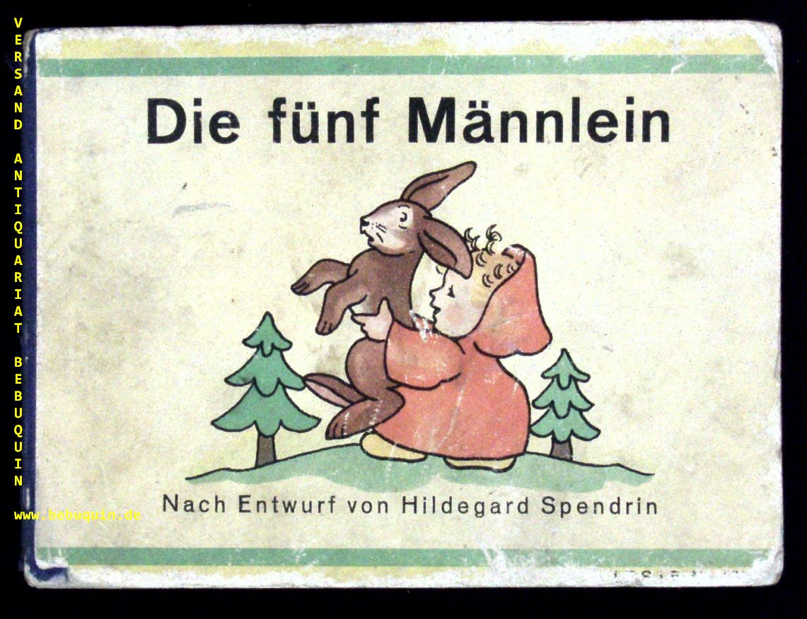 SPENDRIN, Hildegard: Die fünf Männlein. Esslingen (Schreiber), (1948). Quer kl. 8°. 5 Bl. mit farb. Abb. auf Pappe. OHLn. Bindung stärker gelockert, Seiten etwas angeschmutzt. sehr seltenes Kinderbuch. Mück 01645.