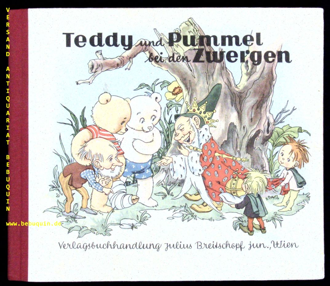 HOFFMANN.– WEILEN, Helene: Teddy und Pummel bei den Zwergen. Wien (Breitschopf), 1952. Quer Gr. 8°. 10 Bl. mit 10 farb. und 10 ausgemalten Bildtafeln von Anny Hoffmann. farb. ill. OHLn. eine kleine Tesareparatur, zur Hälfte von Kinderhand ausgemalt. EA Mück 6070.