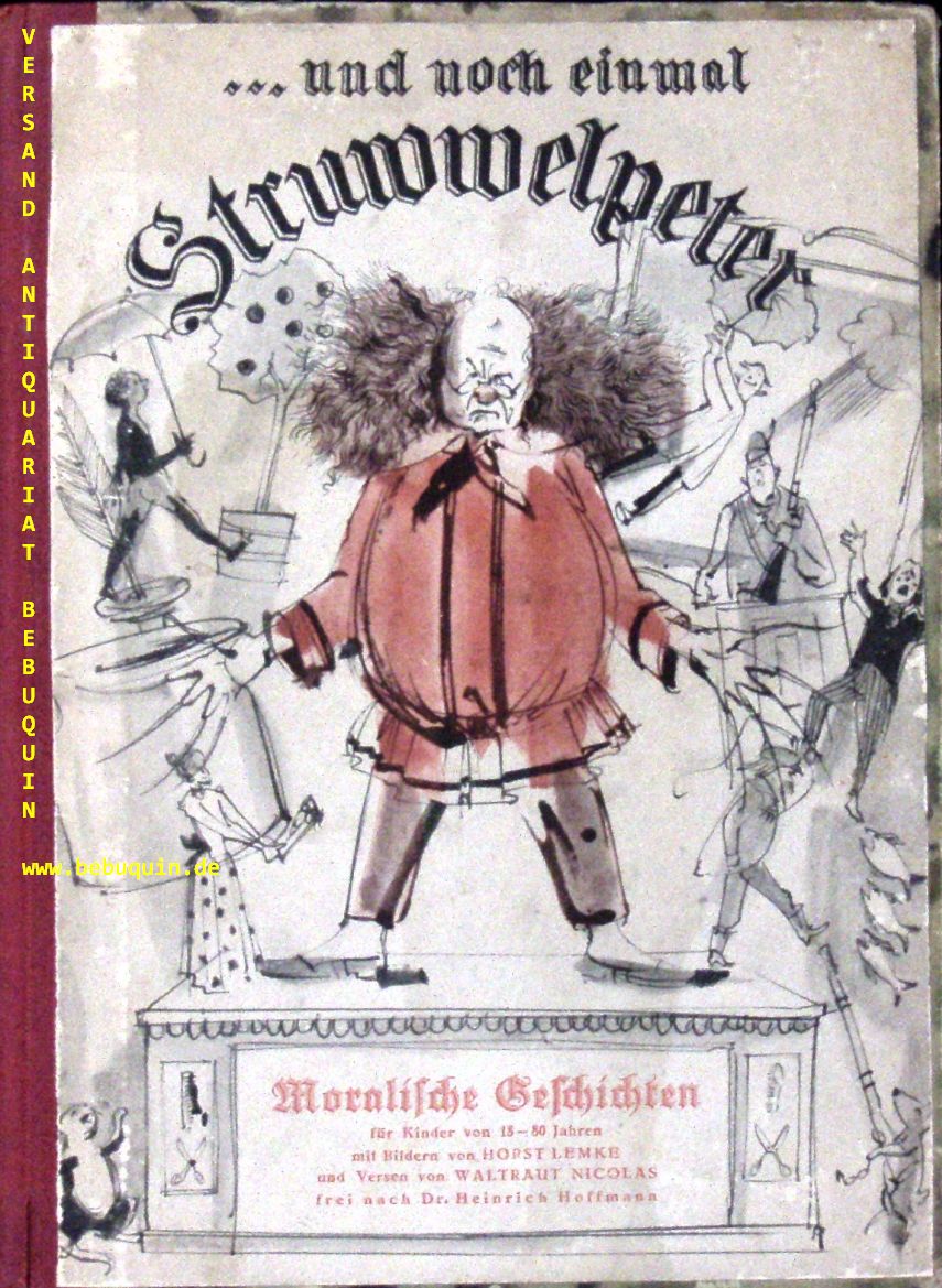 STRUWWELPETER.– NICOLAS, Waltraut: … und noch einmal Struwwelpeter. Moralische Geschichten für Kinder v. 18 – 80 Jahren. Heidelberg (Ähren), 1947. 14 Bl. mit 14 zweifarb. Bildern von Horst Lemke. HLn der Zeit unter Verwendung des farb. ill. Originaldeckels. gutes Ex. 1 von 5000 Ex. dieser einmaligen Ausgabe des Anti-Struwwelpeters.