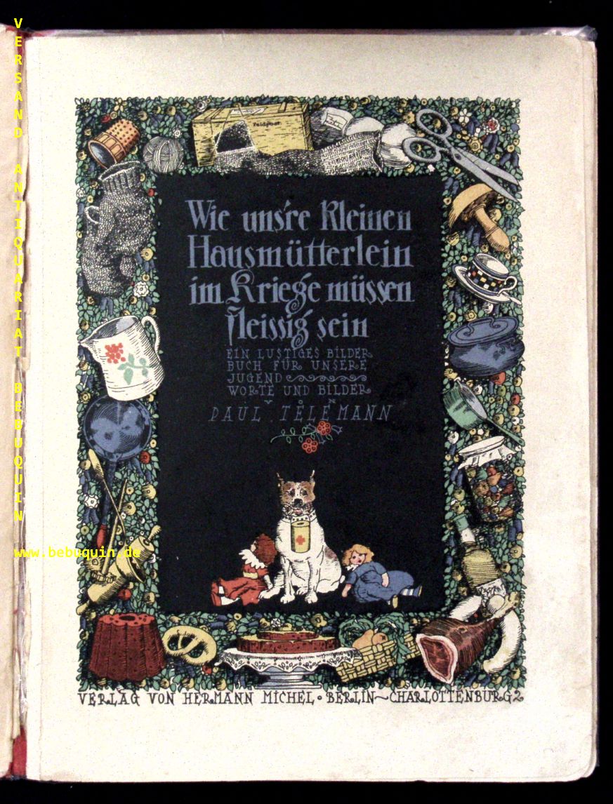 TELEMANN, Paul: Wie uns’re kleinen Hausmütterlein im Kriege müssen fleissig sein. Ein lustiges Bilderbuch für unsere Jugend. Berlin-Charlottenburg (Michel), 1915. Gr. 4°. 8 Bl. mit zahlr. farb. Illustrationen. farb. ill. OHLn. Gelenke sauber stabilisiert, wenige Randläsuren hinterlegt, insgesamt noch gut. Seltene EA dieses eindrucksvollen Kriegsbilderbuchs.