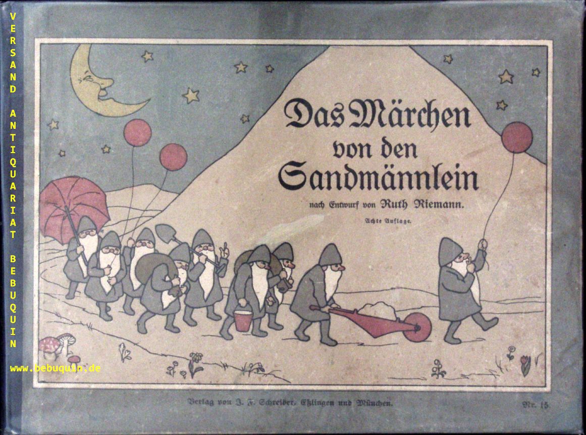 RIEMANN, Ruth: Das Märchen von den Sandmännlein. 8. Aufl. Eßlingen/München, (Schreiber), ca 1920. Quer Gr. 4°. 10 Bl. mit 10 far. Bildtafeln. farb. ill. OHLn. Blattränder teils hinterlegt, ohne Titelblatt (verlagsseitig?).