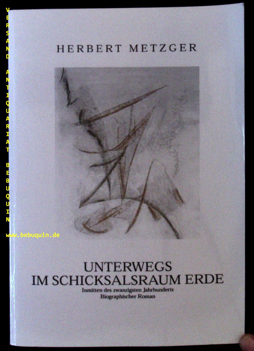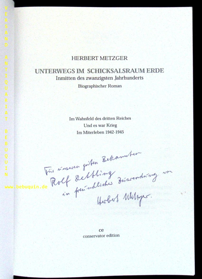 METZGER, Herbert: Unterwegs im Schicksalsraum Erde. Inmitten des zwanzigsten Jahrhunderts. Biographischer Roman. Im Wahnfeld des dritten Reiches. Pforzheim/Norderstedt, Conservator Ed./Libri Books on Demand, 2000. Oktav. 449, 143 S. ill. OKart. etwas bestoßen. EA mit einer eigenhändigen persönlichen Widmung des Verfassers auf Titelseite.
